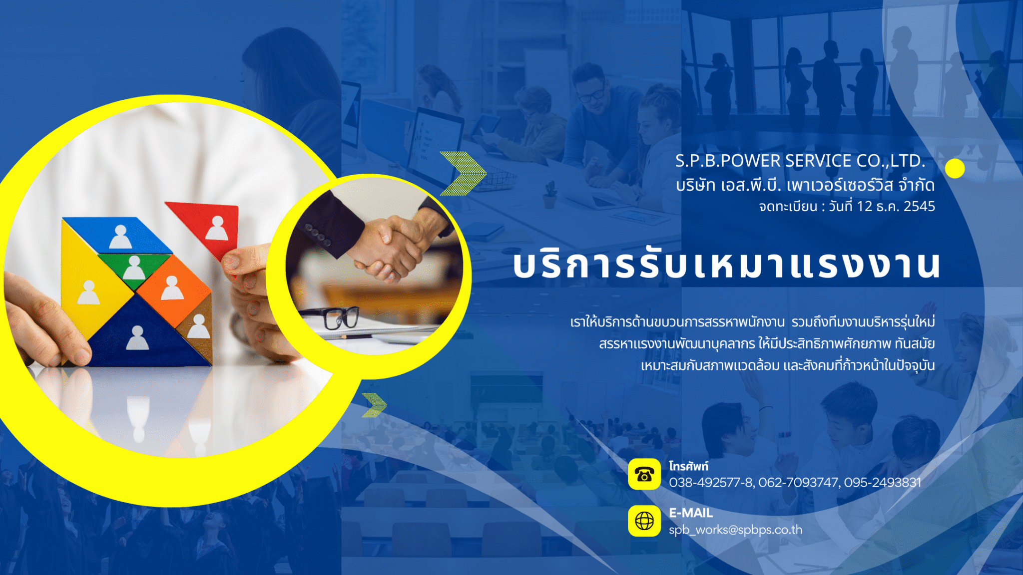 บริษัท เอส.พี.บี. เพาเวอร์เซอร์วิส จำกัด ให้บริการด้านแรงงานครบวงจร ตั้งแต่การสรรหา คัดเลือก จัดจ้าง ไปจนถึงการบริหารจัดการแรงงานในภาคสนาม โดยทีมงานมืออาชีพที่เข้าใจทั้งความต้องการขององค์กรและสิทธิประโยชน์ของแรงงาน เรามุ่งมั่นพัฒนาแนวทางการบริการให้ทันสมัย มีประสิทธิภาพ และตอบโจทย์ทุกธุรกิจ เพื่อให้องค์กรของคุณสามารถดำเนินงานได้อย่างราบรื่นและมั่นใจในทุกขั้นตอน